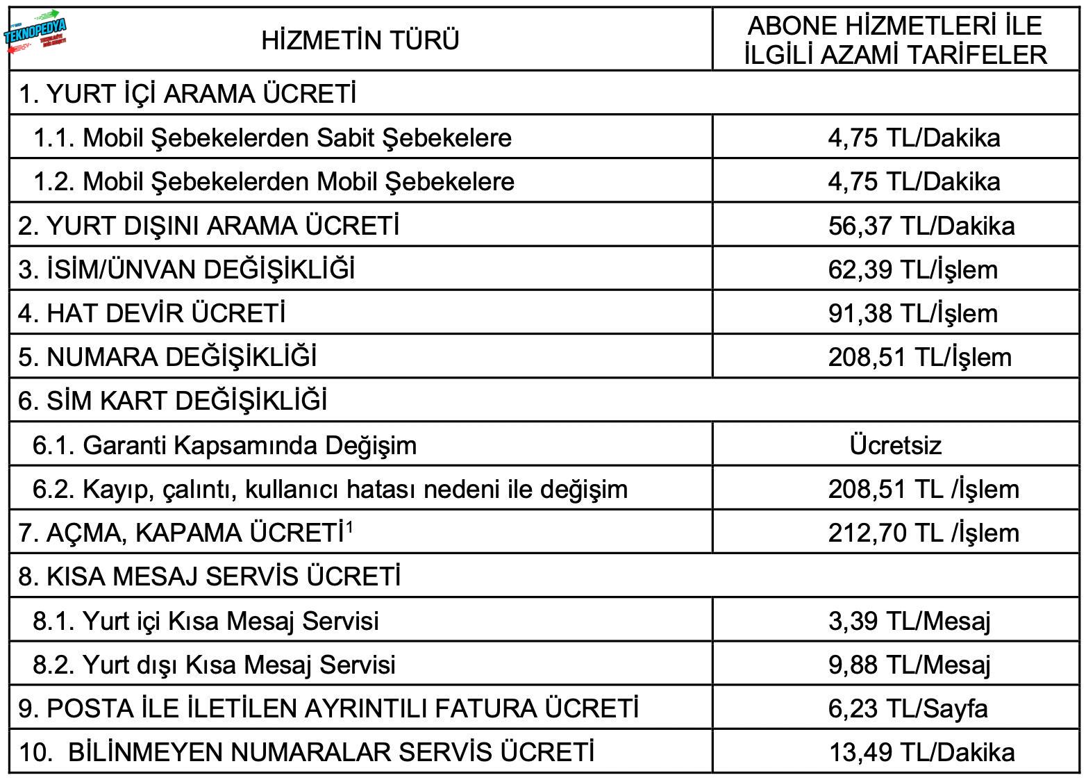 Hat devir ücreti 78,91 TL’den 91,38 TL’ye, açma/kapama ücreti 183,68 TL’den 212,70 TL’ye, garanti kapsamı dışında SIM kart değişikliği 180,06 TL’den 208,51 TL’ye, numara değişikliği ücreti 180,06 TL’den 208,51 TL’ye ve isim değişikliği ücreti 53,88 TL’den 62,39 TL’ye yükseldi.