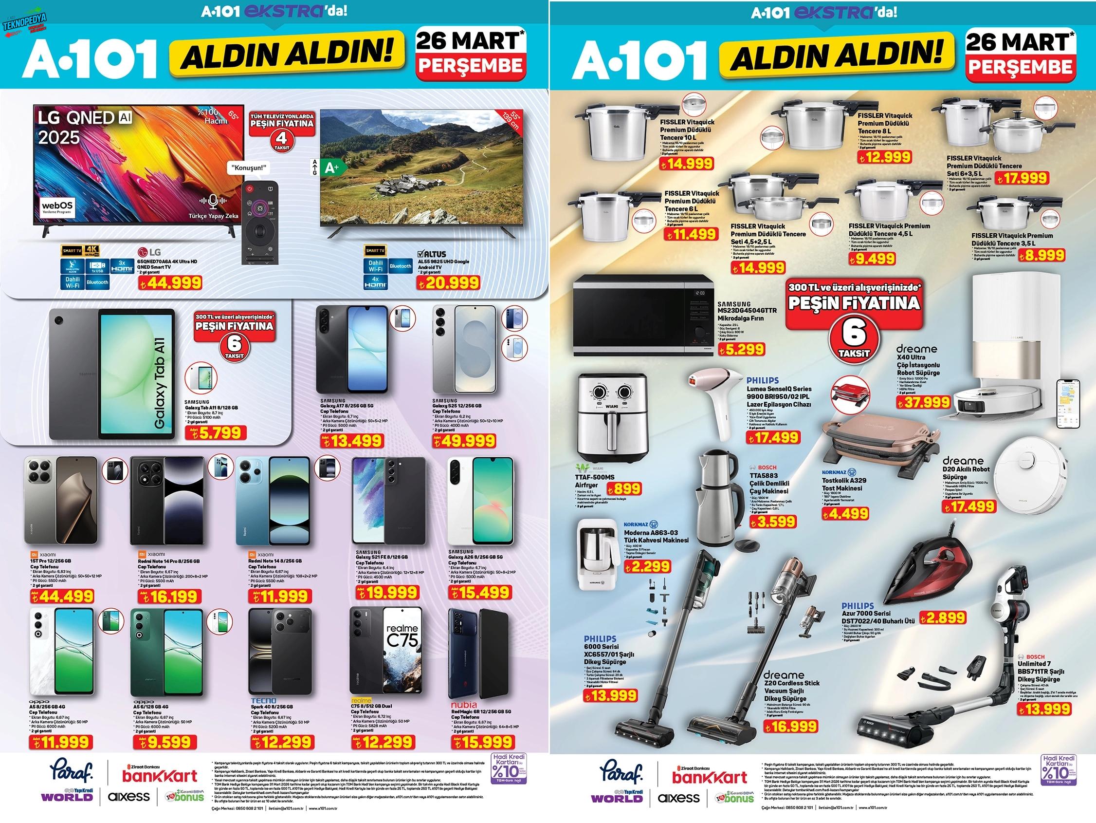 A101 marketlerin Ekstra kataloğunda akıllı telefonlardan tabletlere akıllı televizyonlardan robot süpürgelere, dikey süpürgelere ve airfryer modellerine kadar farklı teknolojik ürünler bulmak mümkün. 26 Mart A101 Ekstra teknoloji ürünleri
