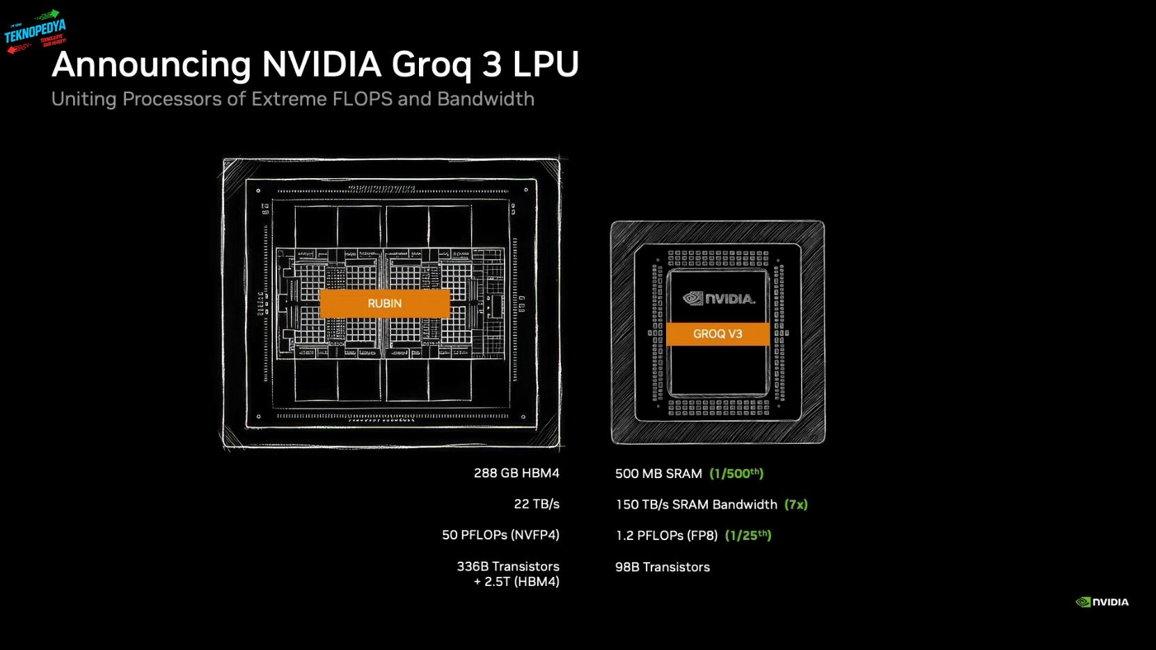 Groq 3, özellikle çıkarım (inference) hızını artıran LPU (Language Processing Unit- Dil İşleme Birimi) olarak dikkat çekiyor. Her LPU, geleneksel yüksek bant genişliğine sahip belleğin yerine çip üzerinde 500 MB SRAM barındırıyor. Bu miktar, Rubin GPU’larındaki 288 GB HBM4’ün yanında küçük kalsa da 150 TB/s bant genişliği ile düşük gecikmeli ve yüksek hacimli token işleme performansı sağlıyor. Rubin platformu Groq 3 öncesinde altı farklı çiple ölçeklenmiş rack sistemleri sunuyordu. Groq 3 LPU, bu yapıya yeni bir yapı taşı olarak eklenerek Rubin’in çok daha yüksek performanslı ve düşük gecikmeli AI çıkarım kapasitesi kazanmasını sağlayacak.