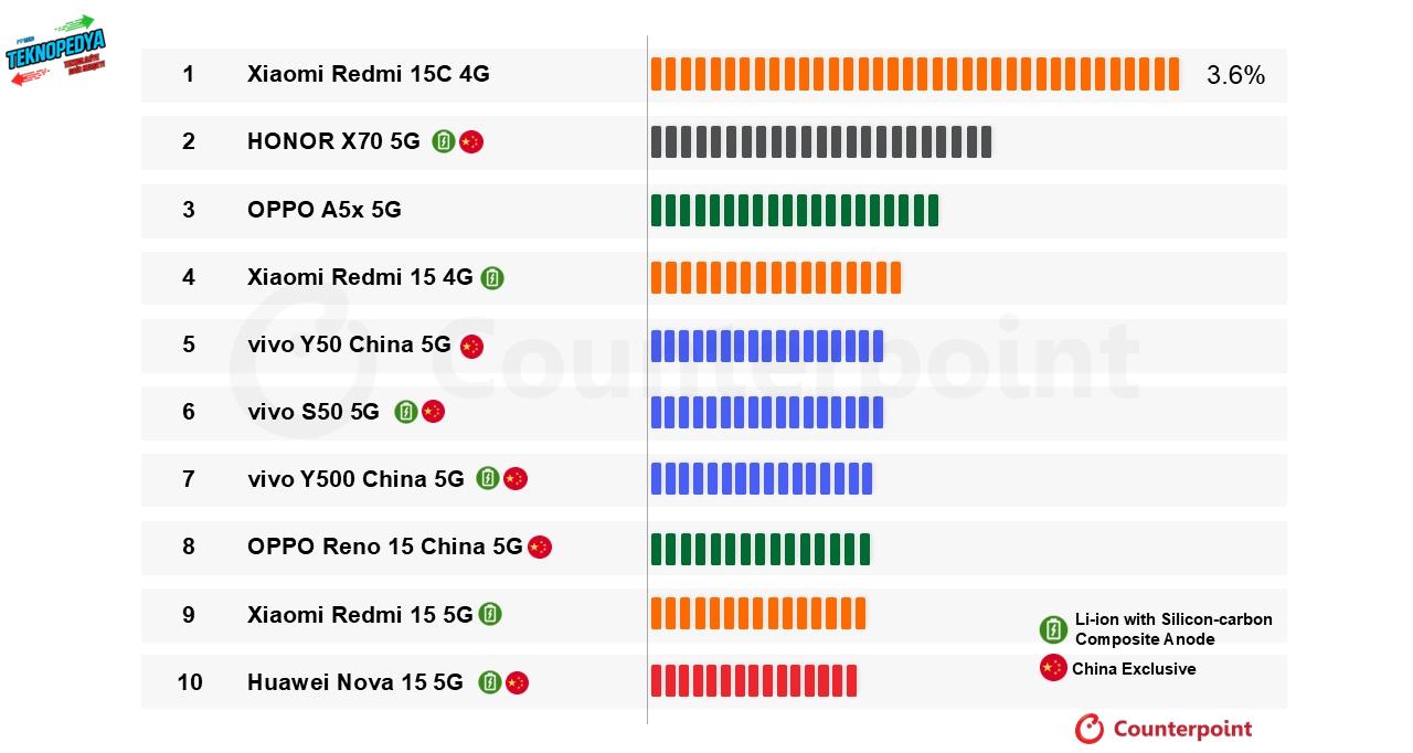 6.000 mAh ve üzeri bataryaya sahip en çok satan telefonlar arasında, klasik lityum iyon pil kullanan Redmi 15C 4G öne çıkıyor. Öte yandan, 8.300 mAh kapasiteye sahip Honor X70 5G listedeki en büyük bataryalı cihaz olarak dikkat çekiyor. İlk 10’daki telefonların 6’sında silikon karbon pil teknolojisi bulunurken, yine altı modelin yalnızca Çin pazarına özel olduğu görülüyor. Counterpoint analistlerinden Harshit Rastogi, listede Çin’e özel cihazların ağırlıkta olmasının, bölgenin batarya teknolojilerindeki hızlı ilerlemesini gösterdiğini belirtiyor. Ayrıca üreticilerin genellikle büyük bataryalı modelleri önce kendi iç pazarlarında piyasaya sürdüğünü de ekliyor.