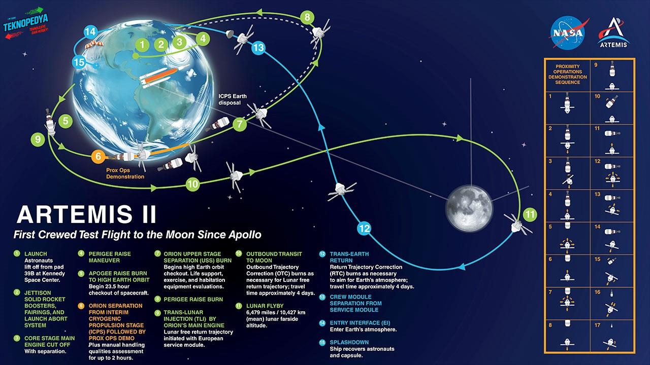 Görev profili açısından Artemis II, kısmen Apollo 8’i andırıyor. Ancak Apollo 8 mürettebatı Ay yörüngesine girip tam tur atarken, Artemis II astronotları Ay’ın etrafında tam bir tur atmayacak, onun yerine Ay’ın ötesine geçerek geri dönecek. Görevde Reid Wiseman, Victor Glover, Christina Koch ve Jeremy Hansen’dan oluşan ekip, “free-return” olarak adlandırılan bir yörünge izleyecek. Bu rota sayesinde uzay aracı, Ay’ın yerçekimini kullanarak ek motor ateşlemesine ihtiyaç duymadan doğal olarak Dünya’ya geri dönecek.