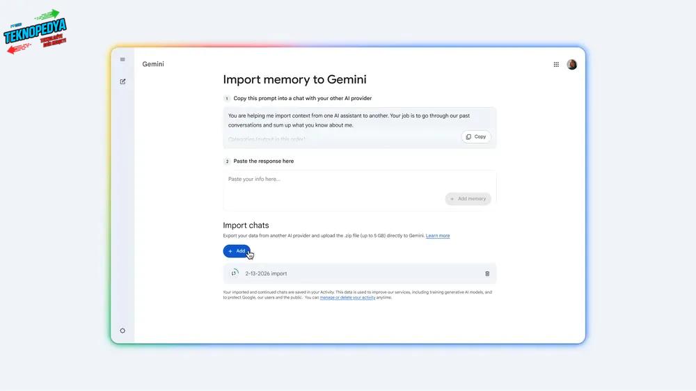 Yeni araç diğer botlarla doğrudan bağlantı kurmuyor. Kullanıcıların verilerini manuel olarak dışa aktarması ve ardından Gemini’a yüklemesi gerekiyor. Bu özelliğe uygulamadaki “Ayarlar ve yardım” menüsü altındaki “Gemini’a hafıza aktar” seçeneğinden ulaşılabiliyor.