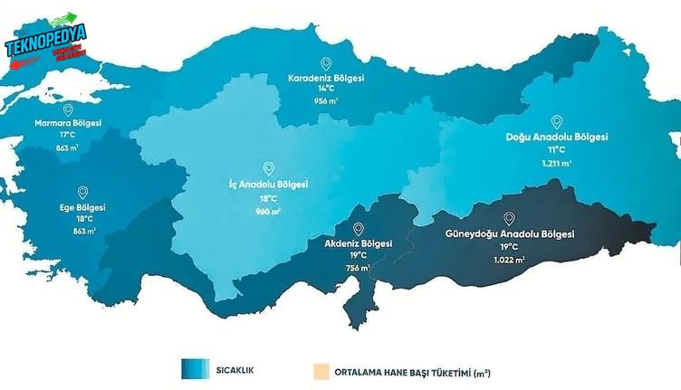 Geçen yıl hane başı ortalama tüketimin en yüksek olduğu il yıllık 1.662 metreküp tüketim ile Hakkari oldu. Hane başı tüketimin en fazla olduğu diğer iller sırasıyla Erzurum, Ardahan, Bitlis ve Van oldu. Ege ve Akdeniz’deki iller Türkiye ortalamasının altında kaldı.