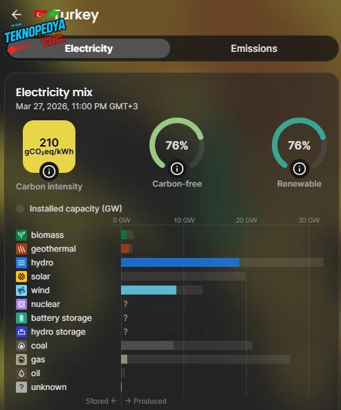 Yenilenebilir enerji kullanımına dair veriler ise oldukça dikkat çekici. Electricity Maps’in EPİAŞ verileri üzerinden elde ettiği bilgilere göre 28 Mart’ta gece yarısında Türkiye’nin ürettiği elektriğin yüzde 76’sı yenilenebilir kaynaklardan karşılandı. Bu üretimin yüzde 47,99’u hidroelektrik, yüzde 22,43’ü rüzgar enerjisinden sağlandı.
