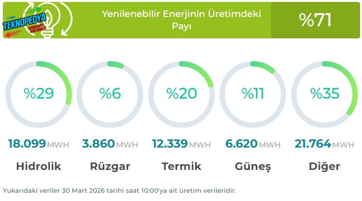 TEİAŞ verilerine göre Türkiye’nin toplam kurulu gücü 124.320 MW seviyesinde bulunuyor. 30 Mart itibariyle ise elektrik üretiminde yenilenebilir enerjinin payı yaklaşık yüzde 71 olarak kaydedildi. Bu payın dağılımına bakıldığında, hidrolik 18.169 MWh (yüzde 29), rüzgar 3.888 MWh (yüzde 6), güneş 6.692 MWh (yüzde 11) ve termik üretim 12.523 MWh (yüzde 20) olarak öne çıkıyor. Diğer kaynakların katkısı ise 21.851 MWh ile yüzde 35 seviyesinde gerçekleşti. Türkiye, 2035 yılına kadar güneş ve rüzgar kaynaklarından toplam 120 GW kurulu güç hedefine ulaşmayı hedefliyor. Bu hedef doğrultusunda yaklaşık 80 milyar dolarlık yeni yatırımın hayata geçirilmesi planlanıyor.