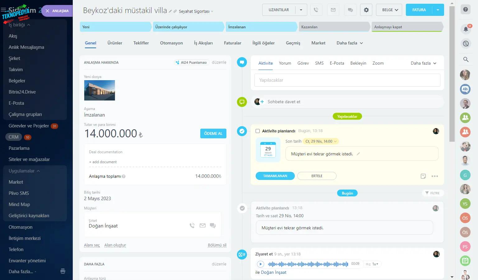 Platformun öne çıkan bir diğer yönü ise kurumsal hafıza oluşturma yaklaşımı. Emlak sektöründe danışman değişiklikleri sık yaşanabiliyor ve bu durum müşteri bilgilerinin kaybolmasına yol açabiliyor. Bitrix24 ise tüm müşteri geçmişini tek bir merkezde saklayarak bu riski ortadan kaldırmayı hedefliyor. Bir müşteriyle yapılan tüm görüşmeler, paylaşılan portföyler ve satış süreci kayıt altına alındığı için yeni bir danışman sürece kaldığı yerden devam edebiliyor.