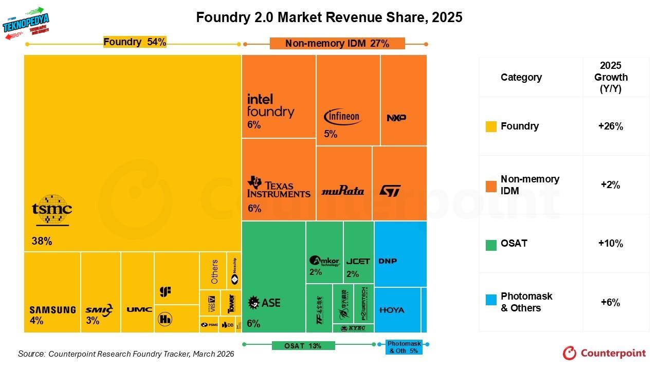 Counterpoint’in “Foundry 2.0” olarak adlandırdığı genişletilmiş tanıma, saf dökümhaneler, bellek dışı entegre cihaz üreticileri (IDM), dış kaynaklı yarı iletken montaj ve test şirketleri (OSAT) ve fotomaske tedarikçileri dahil ediliyor. Bu kapsamda saf dökümhaneler gelirin %54’ünü oluştururken yıllık %26 büyüme kaydetti. Bellek dışı IDM’ler ise %27 pay aldı ve sadece %2 büyüme gösterdi.