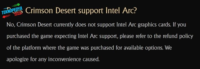 Pearl Abyss, daha önce Intel Arc ekran kartları için destek sunulmadığını açıkça belirtmiş ve kullanıcılara iade politikalarına yönelmeleri tavsiye edilmişti. Ancak bu yaklaşım kısa sürede değişti. Stüdyo, yaptığı güncellemeyle birlikte oyunun Intel Arc sistemlerde açılabildiğini doğruladı. Buna karşın destek henüz tamamlanmış değil.