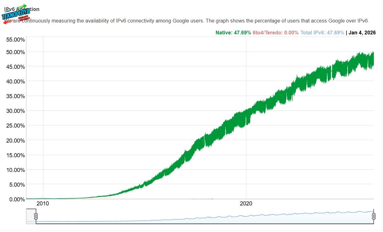 Google’ın paylaştığı verilere göre, 28 Mart tarihinde dünya genelinde internet kullanıcılarının %50’si kısa süreliğine IPv6 üzerinden bağlantı kurarak tarihte bir ilki gerçekleştirdi. APNIC verileri, IPv6 kullanım oranının küresel çapta %43’e ulaştığını gösterirken; Asya ve Amerika kıtalarının bu oranı %50 seviyesine yaklaştırdığı belirtiliyor. Cloudflare ise internet trafiğinin yaklaşık %40’ının IPv6 üzerinden gerçekleştiğini ortaya koyuyor. Türkiye’de IPv6 kullanımı ne durumda?