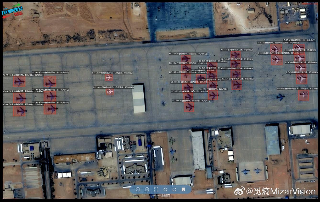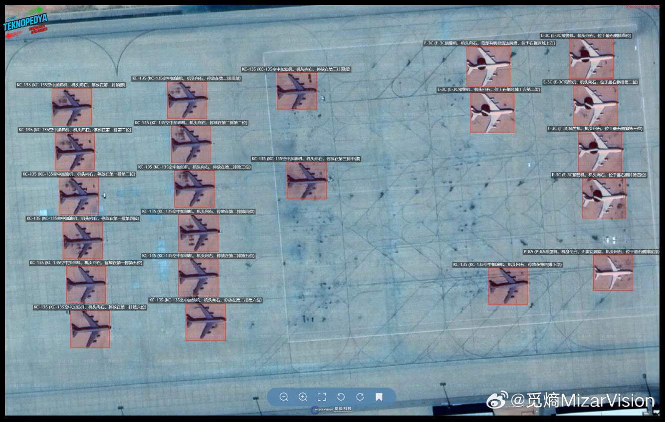 MizarVision’ın sunduğu sistem, yüksek çözünürlüklü uydu görüntülerini yapay zeka ile işleyerek askeri unsurları, altyapıyı ve lojistik noktaları otomatik olarak işaretliyor. Uçaklar, korunaklı hangarlar, yakıt depoları, radarlar ve yoğunlaşmış birlik bölgeleri gibi kritik hedefler geniş alanlar içinde hızlı şekilde tespit edilebiliyor.