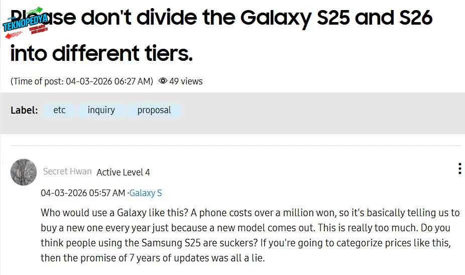 Yazılım dağıtımında genellikle ana vatanı Güney Kore’yi ön planda tutan Samsung, kendi topluluk forumlarında büyük bir tepkiyle karşılaşıyor. S25 sahipleri, şirketin kendilerine ikinci sınıf muamele yaptığını düşünüyor ve firmanın 7 yıllık işletim sistemi güncelleme sözünü tutma konusunda öncelikli davranmadığını savunuyor. Kullanıcılar, yeni telefonlarla aynı parayı ödedikleri cihazlarının bir yıl içinde geri plana atılmasından oldukça rahatsız.