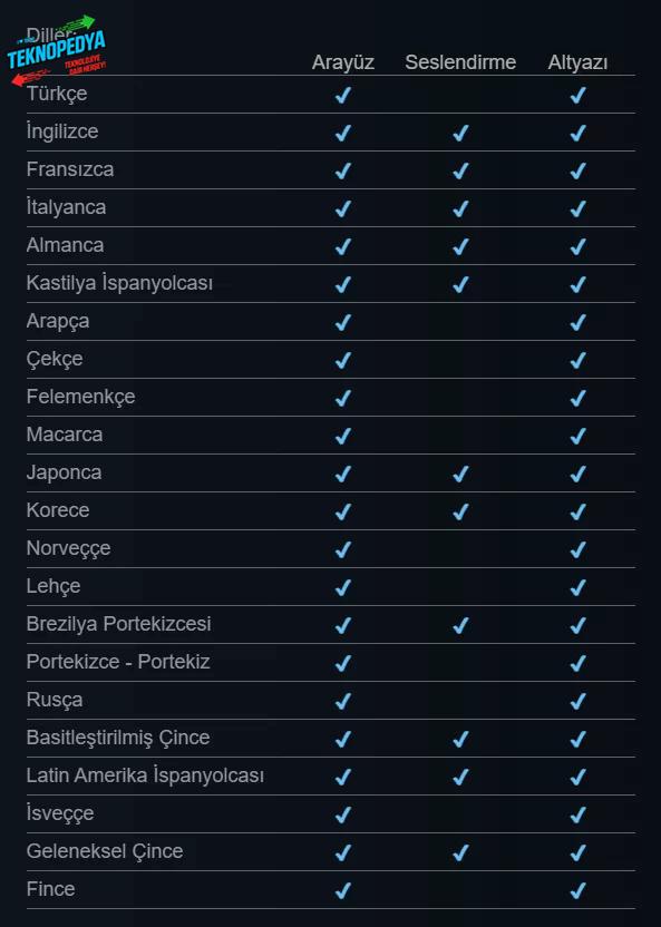 Paylaşılan listede maalesef Türkçe seslendirme seçeneğinin bulunmadığı göze çarpıyor. Seslendirme tarafında İngilizce, Fransızca, Almanca ve Japonca gibi diller tam destek alırken, Türkçe tıpkı Arapça, Çekçe ve Felemenkçe gibi metin tabanlı bir yerelleştirme ile oyunculara sunulacak. Yine de serinin bu önemli oyununun ilk günden yerelleştirme alması büyük bir adım olarak değerlendiriliyor.