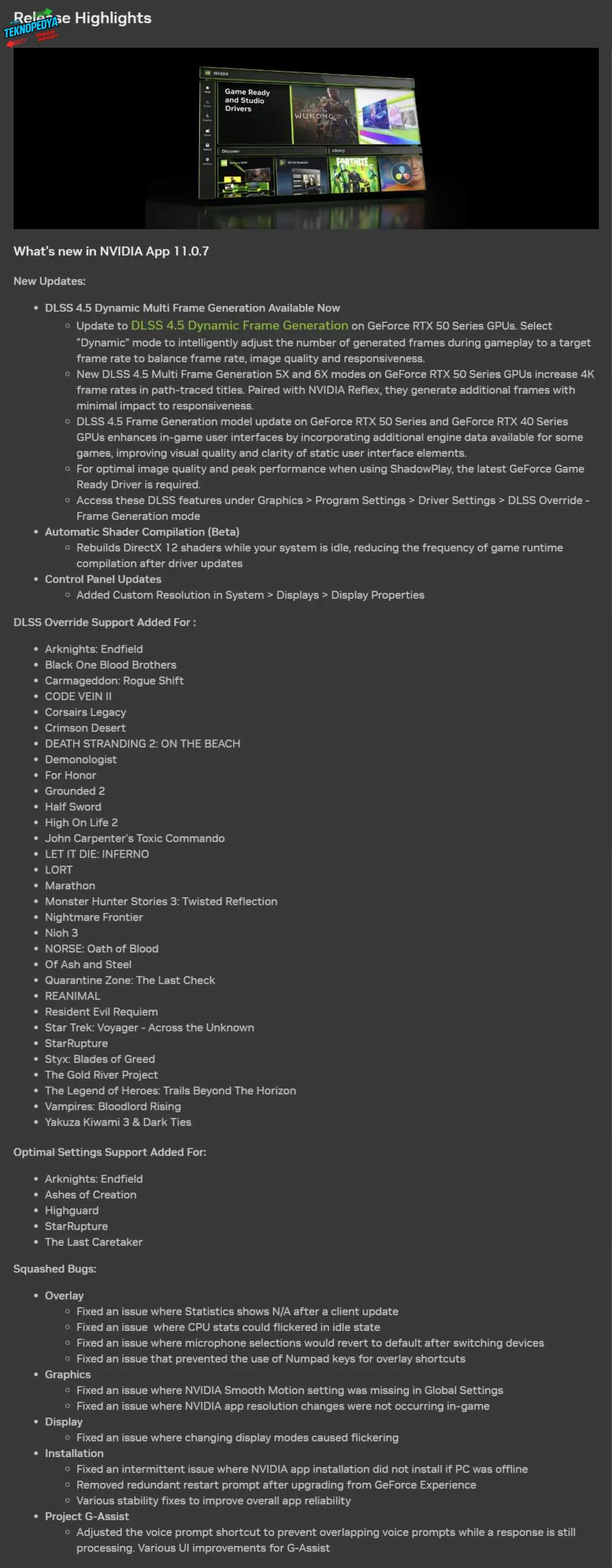 Yeni güncellemeyle birlikte Arknights: Endfield, Black One Blood Brothers, Carmageddon: Rogue Shift, CODE VEIN II, Corsairs Legacy, Crimson Desert, DEATH STRANDING 2: ON THE BEACH, Demonologist, For Honor, Grounded 2, Half Sword, High On Life 2, John Carpenter’s Toxic Commando, LET IT DIE: INFERNO, LORT, Marathon, Monster Hunter Stories 3: Twisted Reflection, Nightmare Frontier, Nioh 3, NORSE: Oath of Blood, Of Ash and Steel, Quarantine Zone: The Last Check, REANIMAL, Resident Evil Requiem, Star Trek: Voyager – Across the Unknown, StarRupture, Styx: Blades of Greed, The Gold River Project, The Legend of Heroes: Trails Beyond The Horizon, Vampires: Bloodlord Rising ve Yakuza Kiwami 3 & Dark Ties oyunları için DLSS Override desteği kullanıma sunuldu. Ek olarak Arknights: Endfield, Ashes of Creation, Highguard, StarRupture ve The Last Caretaker oyunlarına tek tıkla uygulanabilen optimum ayar desteği getirildi.
