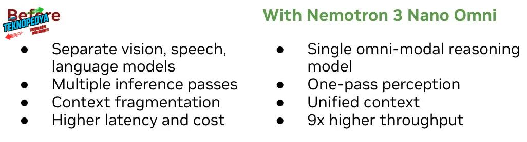 - NVIDIA Nemotron 3 Nano Omni, çok modlu işlemlerde 9 kat daha fazla iş hacmi sunarak verimliliği artırıyor.