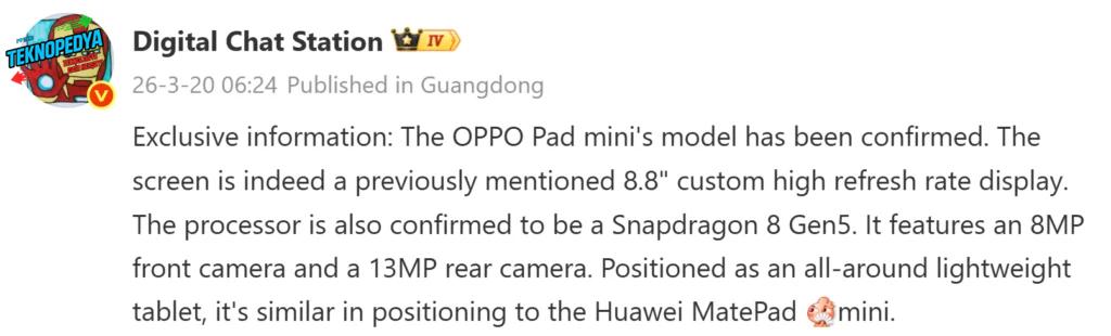 Sızıntılarıyla ünlü Digital Chat Station tarafından paylaşılan detaylara göre, cihaz dengeli bir performansı son derece ince ve hafif bir tasarımla buluşturmayı hedefliyor. Premium segmentte şık ve kompakt bir seçenek olarak konumlandırılan tablet, 8.8 inç büyüklüğünde ve yüksek yenileme hızına sahip özelleştirilmiş bir ekranla kullanıcıların karşısına çıkacak.