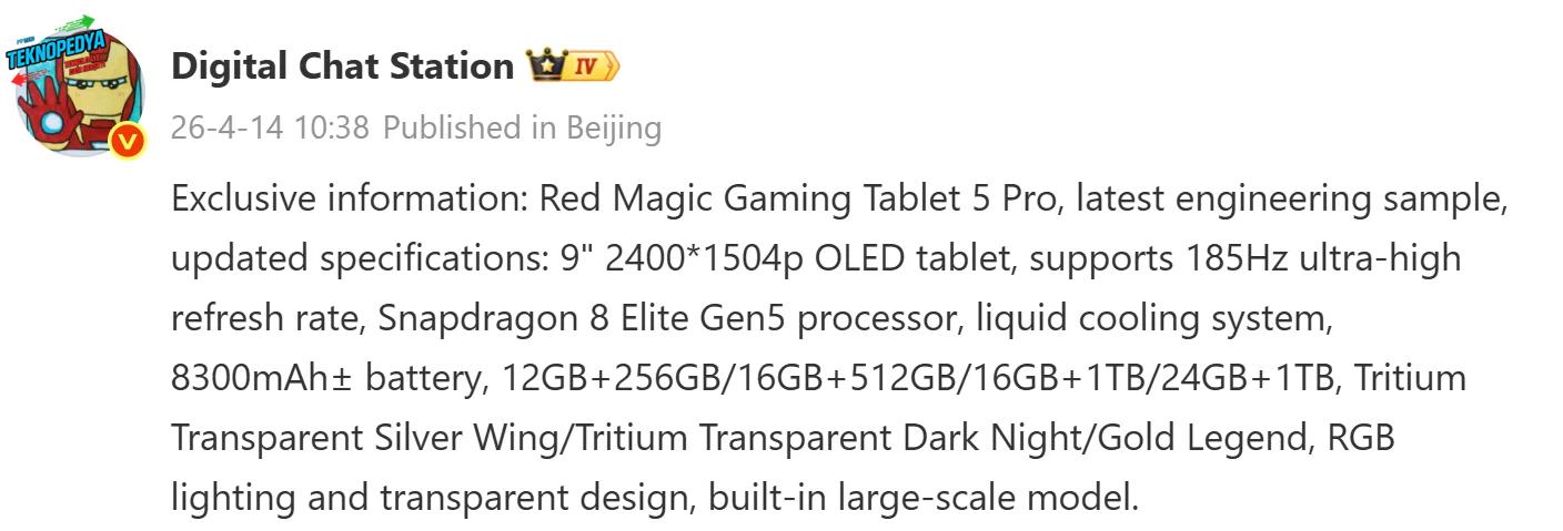 Anasayfa / Teknoloji / Mobil / Red Magic Gaming Tablet 5 Pro Özellikleri Sızdırıldı
