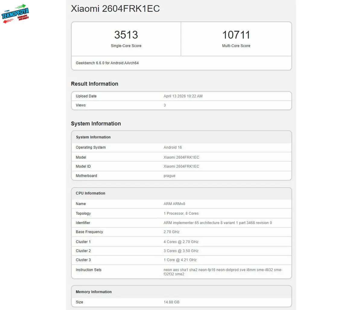 Geekbench 6.6 veritabanında 2604FRK1EC model numarasıyla görüntülenen Redmi K90 Max, oldukça iddialı bir performans sergiledi.