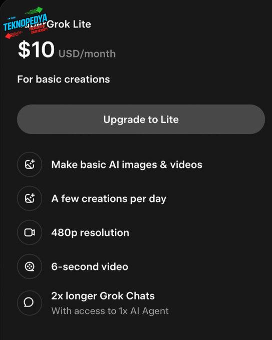 Elon Musk tarafından duyurulan SuperGrok Lite ise daha uygun bir fiyata tatmin edici Grok özellikleri sunuyor. 480p videolar, 2 kat daha uzun Grok sohbetleri, belirli bir kotada video ve görsel oluşturma avantajları sunuluyor. SuperGrok Lite aboneliği aylık 10$ ancak henüz tüm kullanıcıların erişimine açılmış değil.