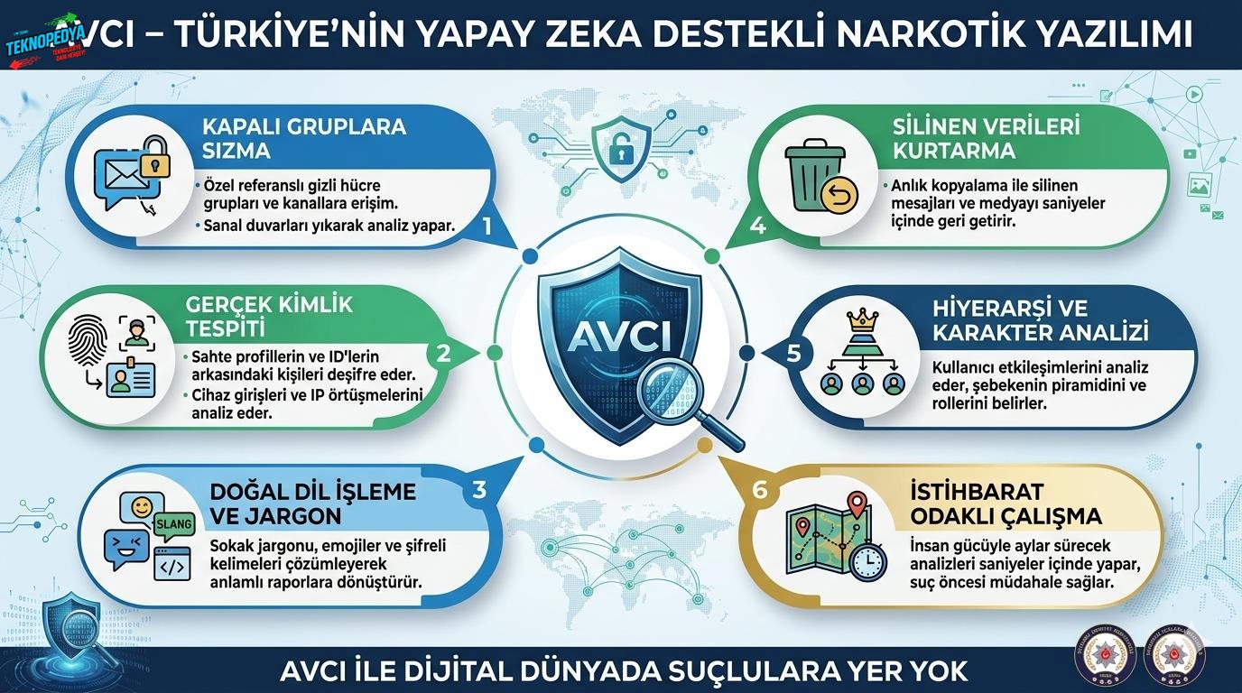 İstanbul Emniyet Müdürlüğü, Yapay zeka destekli Açık Kaynak İstihbaratı Analiz Sistemi (AVCI) ile uyuşturucu satıcılarının kapalı gruplardaki iletişim ağlarına sızarak dijital ortamda suç işlenmeden önce tespit ve önlem sağlıyor. Aktarılanlara göre AVCI, uçtan uca şifreli iletişim uygulamalarına sızabiliyor. Sistem, yerli ve milli bir yazılım olarak geleneksel polislik anlayışını yapay zeka ve büyük veri analizleriyle birleştiriyor, böylece organize suç örgütlerinin dijital alanlardaki görünmezlik zırhını ortadan kaldırıyor.