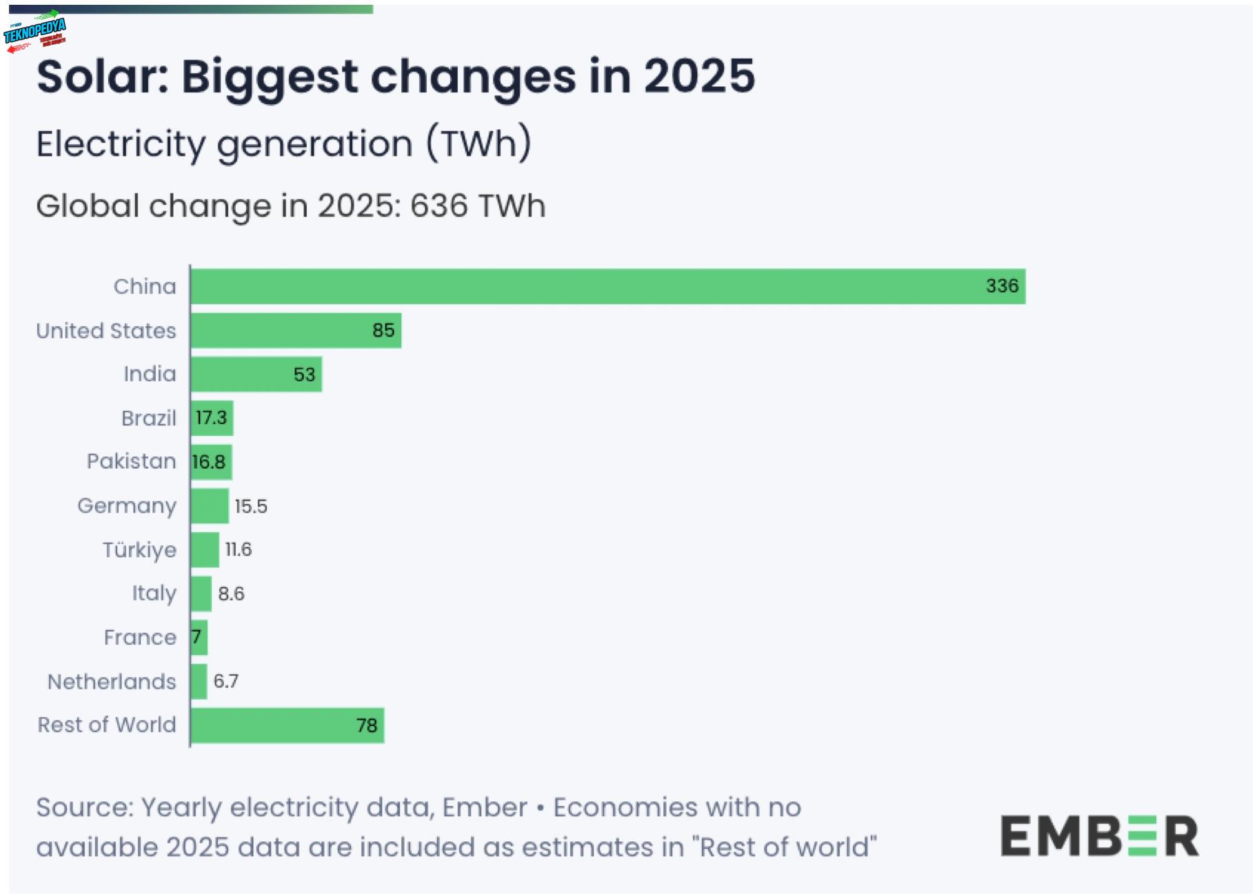 Dünya genelinde güneşten elektrik üretimi %30 oranında artarak son 8 yılın en hızlı büyümesi elde edildi. Toplam üretimde güneşin payı %8,7’ye yükseldi. Çin, güneş enerjisinden elektrik üretimini en fazla artıran ülke olurken ikinci sırada ABD yer aldı. Bu ülkeleri Hindistan, Brezilya, Pakistan ve Almanya izledi. Türkiye ise bu ülkelerin ardına yerleşerek 7’inci sırada yer aldı.