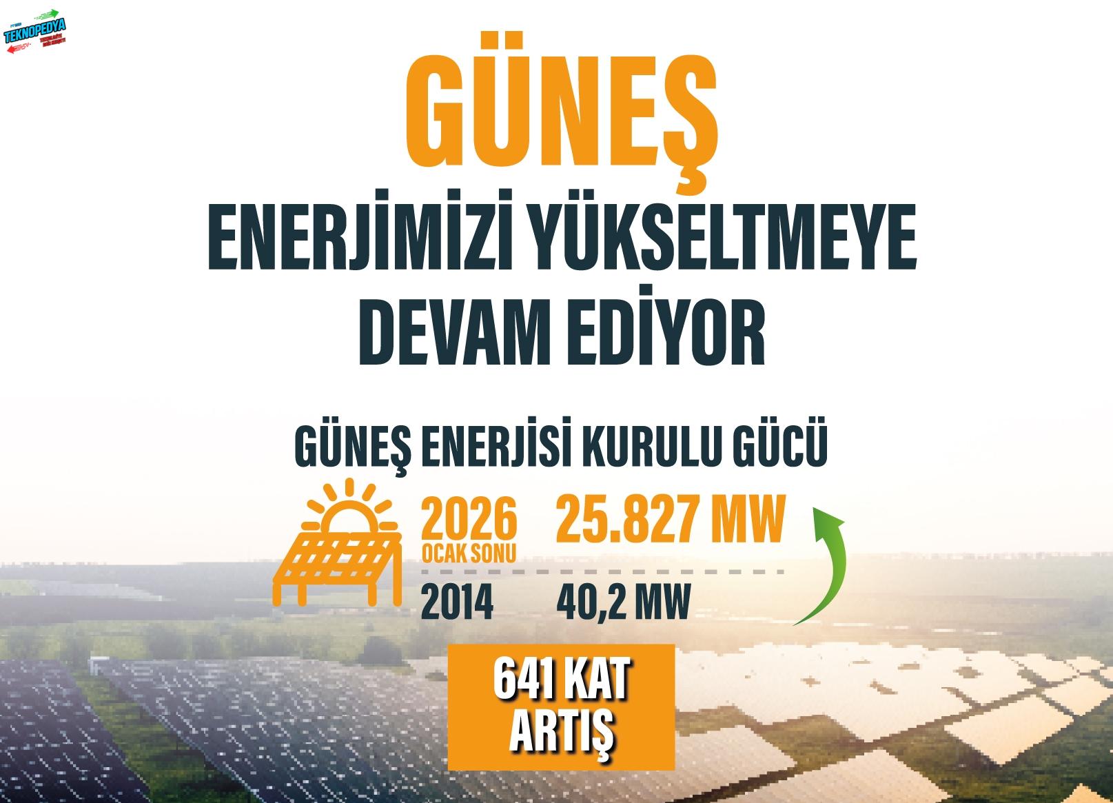 Geçtiğimiz yıl Türkiye, güneş enerjisi yatırımlarını hızla artırarak 4,7 GW yeni kapasiteyi sisteme dahil etmişti. Ülkenin ulusal iletim sistemi operatörü TEİAŞ’ın verilerine göre 2025 sonunda toplam güneş kapasitesi 24 bin 795 MW olarak kaydedilmişti. Bakanlığa göre Ocak 2026 sonu itibariyle ise 25 GW seviyesi geride bırakıldı. 2014’te 17 gigavatsaat olan güneşten elektrik üretimi de 2025 sonunda 38 bin 69 gigavatsaat seviyesine ulaştı.