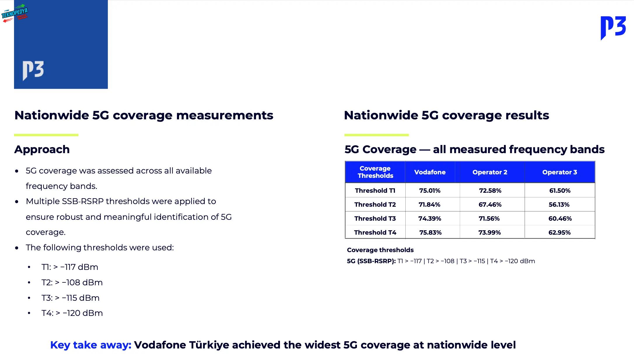 P3 tarafından 1-8 Nisan tarihleri arasında toplam 30 bin kilometrelik alanda yapılan değerlendirmede 5G kapsama alanı mevcut tüm frekans bantlarında değerlendirildi.
