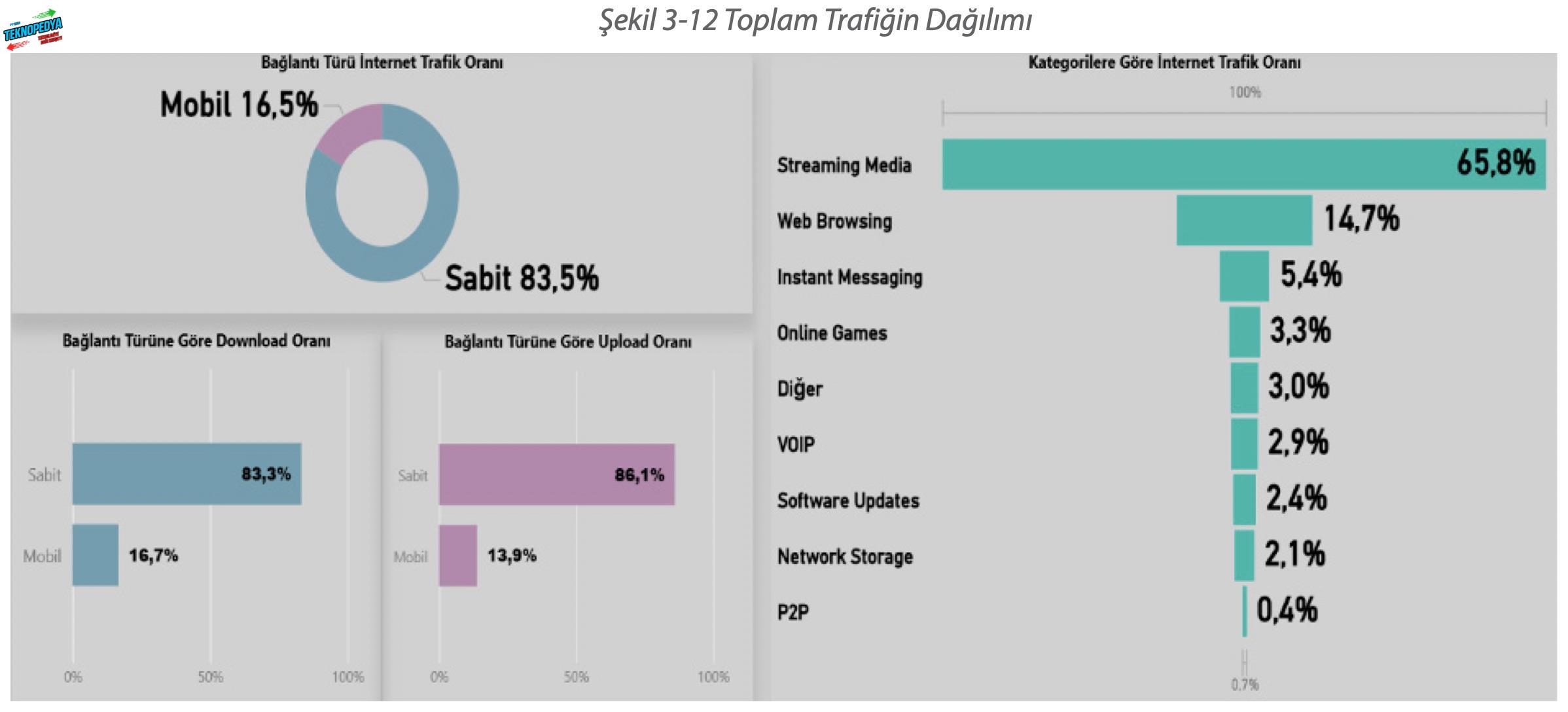 BTK raporuna göre Türkiye’de toplam internet trafiğinin çok büyük bölümünü (yüzde 65,8) medya akış platformları oluşturuyor. Ardından yüzde 14,7 ile webde gezinme, yüzde 5,4 ile anlık mesajlaşma ve yüzde 3,3 ile online oyunlar takip ediyor.