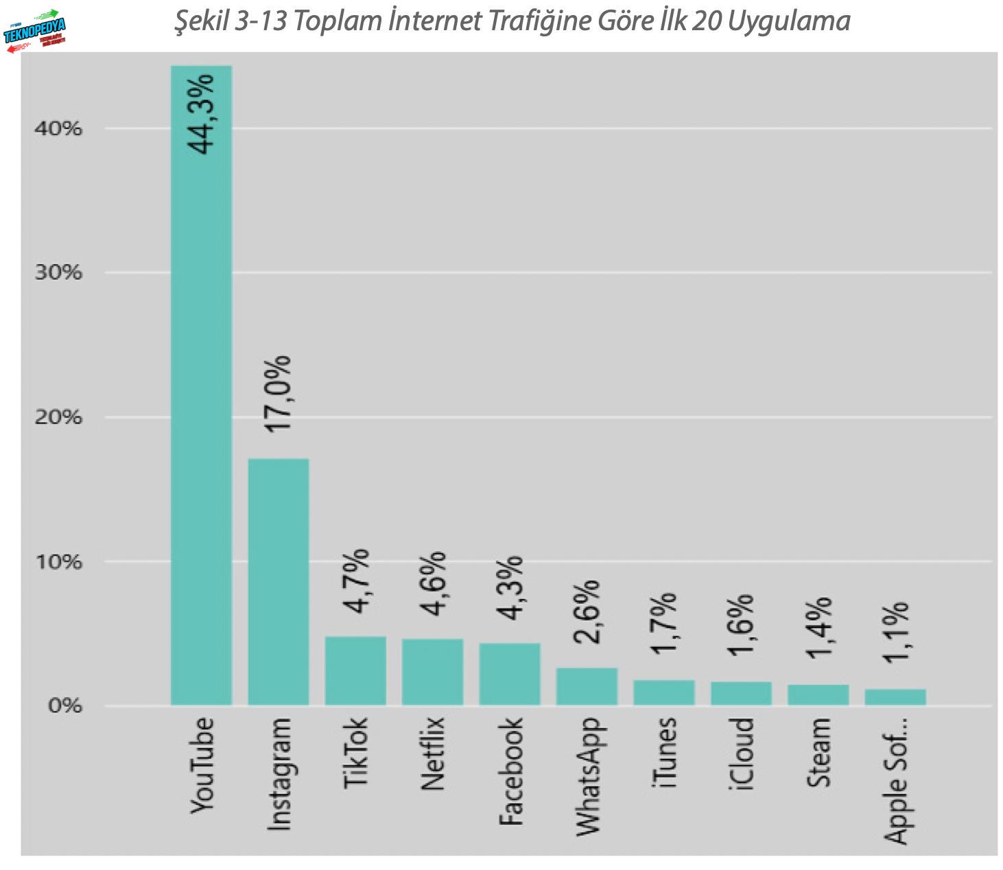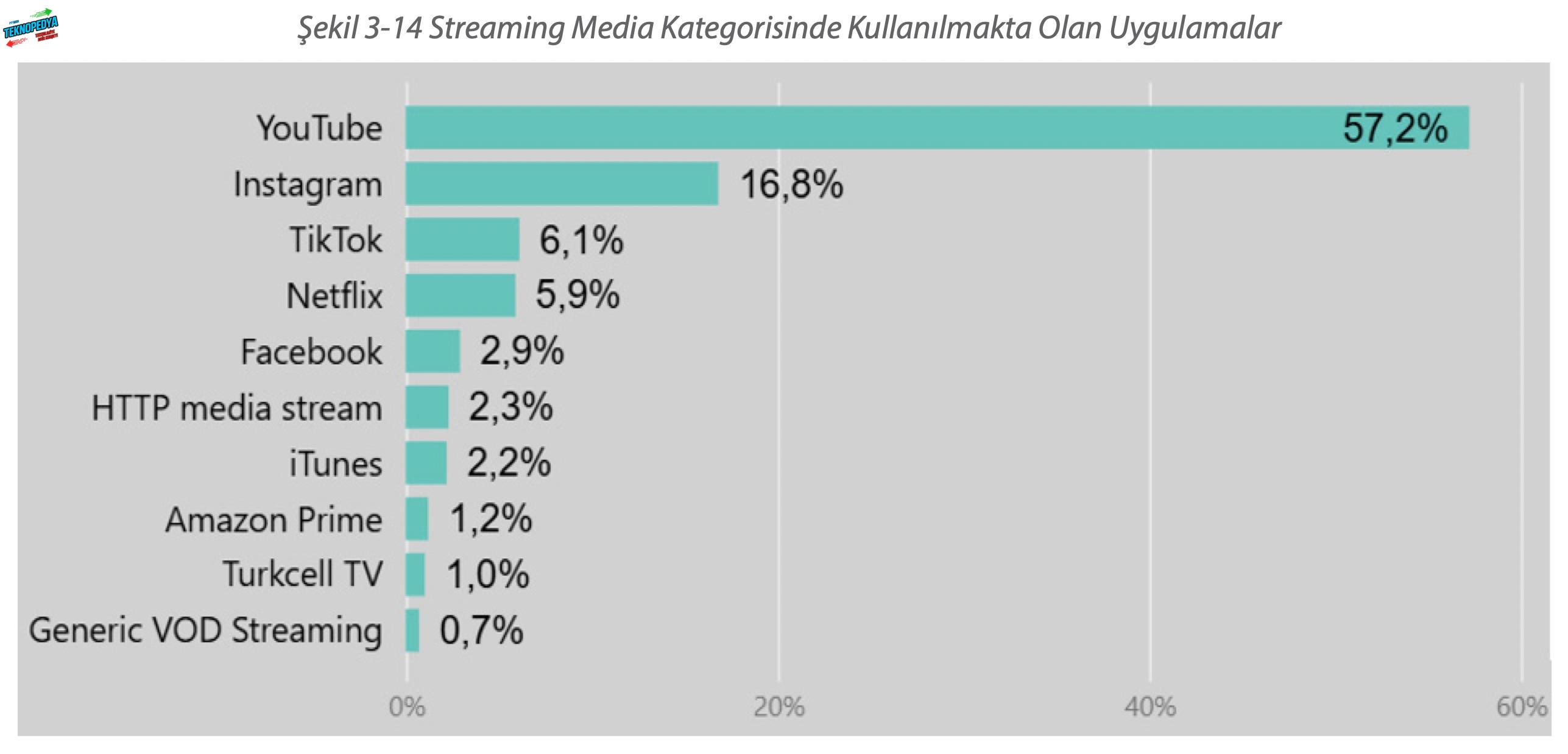 Medya akış (Streaming Media) kategorisinde en çok internet trafiği oluşturan uygulama yüzde 57,2 ile YouTube olurken onu yüzde 16,8 ile Instagram ve yüzde 6,1 ile TikTok takip etti. Medya akış kategorisinde yüzde 5,9’luk trafik payına sahip olan Netflix ise en çok trafik tüketen dijital içerik platformu oldu.