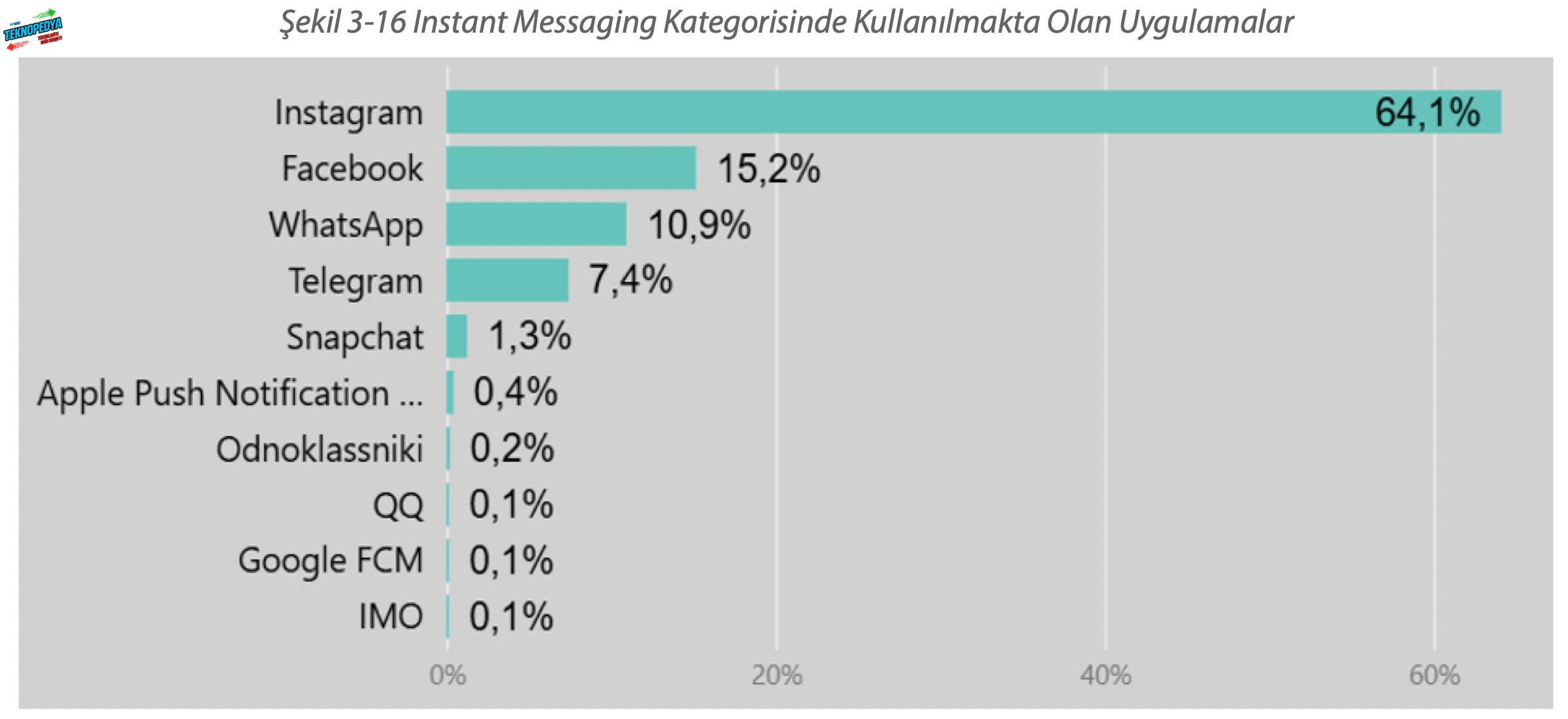 Anlık mesajlaşma kategorisinde internet trafiğinin yüzde 64,1’ini Instagram, yüzde 15,2’sini Facebook ve yüzde 10,9’unu WhatsApp ve yüzde 7,4’ünü Telegram oluşturdu. WhatsApp ile Telegram arasındaki farkın yalnızca yüzde 3,5’lik fark olması şaşırttı.