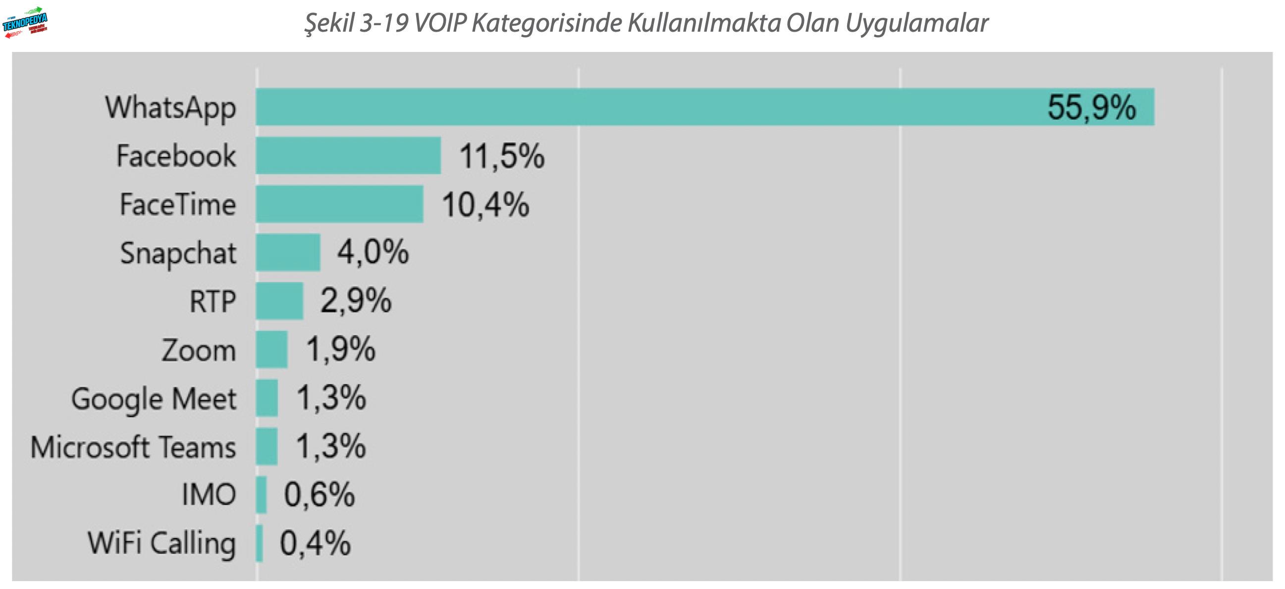 İnternet üzerinden sesli veya görüntülü görüşme uygulamalarında ise WhatsApp yüzde 55,9 ile birinci sırada. Sonrasında yüzde 11,5 ile Facebook ve yüzde 10,4 ile FaceTime geliyor.