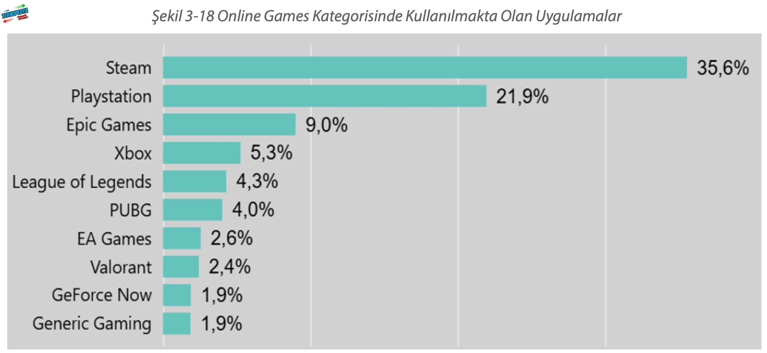 Online oyun kategorisindeki trafik tüketimi incelendiğinde ise burada Steam’in yüzde 35,6 pay ile zirvede yer aldığı, sonrasında ise yüzde 21,9 ile PlayStation’un, yüzde 9 ile Epic Games’in, yüzde 5,3 ile Xbox’ın takip ettiğini görüyoruz.