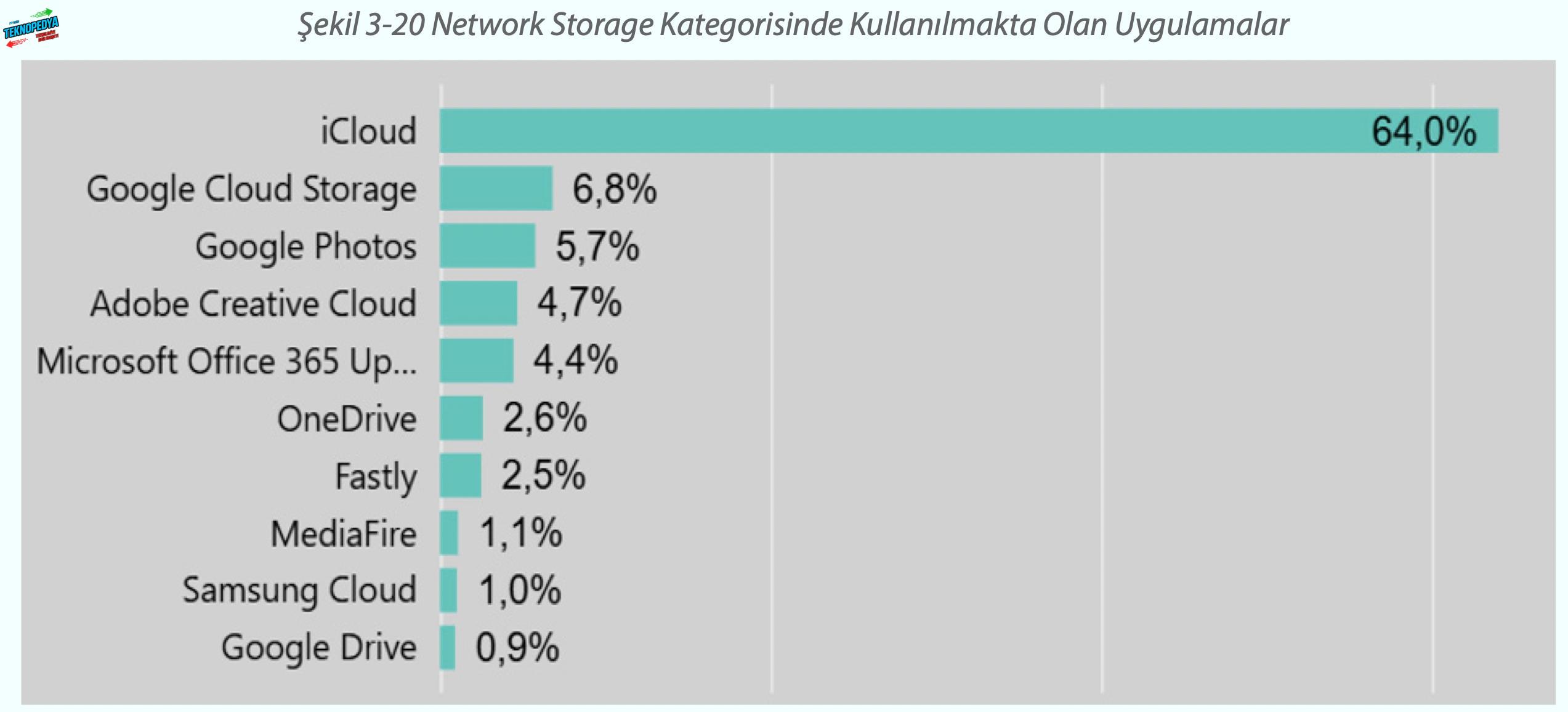 Bulut tabanlı depolama platformlarının trafik tüketimleri incelendiğinde iCloud yüzde 64’lük pay ile rakiplerine açık ara fark atarken ardından yüzde 6,8 ile Google Cloud ve yüzde 5,7 ile Google Fotoğraflar geliyor.