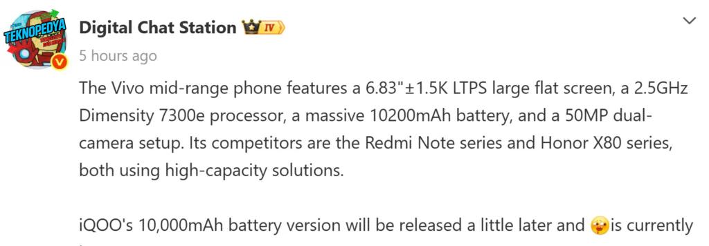 Kamera tarafında ise resmi afişlerle onaylanan 50 megapiksellik ana lense, batarya ve performans odaklı bu cihazın maliyetlerini dengelemek amacıyla muhtemelen temel düzeyde 2 megapiksellik bir ikincil sensör eşlik edecek. Bu ayın sonlarında resmi olarak tanıtılması beklenen Vivo Y600 Pro’nun, pazarın diğer iddialı yüksek bataryalı serileri olması beklenen Redmi Note 17 ve Honor X80 ailesiyle kıyasıya bir rekabete gireceği öngörülüyor. Ayrıca gelen ek bilgiler, Vivo’nun alt markası iQOO’nun da benzer devasa bataryalı bir akıllı telefon üzerinde çalıştığını işaret ediyor.
