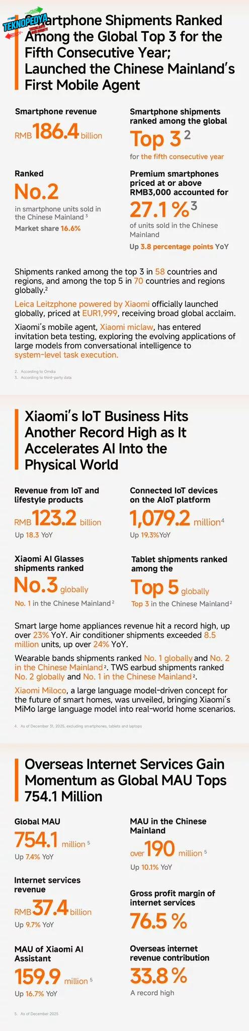 Elde edilen başarı sadece telefonlarla sınırlı kalmadı. Küresel pazarda Xiaomi tabletler ilk beşte, giyilebilir teknolojiler birinci ve kablosuz kulaklıklar ikinci sırada yer aldı. Markanın Nesnelerin İnterneti (IoT) ve hizmetler ekosistemi 750 milyondan fazla aylık aktif kullanıcıya erişirken, bu alanın geliri yüzde 18,3 artışla 123,2 milyar yuana çıktı. Büyük ev aletleri sevkiyatlarında tüm zamanların en yüksek seviyesi görülürken, buradan elde edilen gelir de yüzde 23,1 oranında arttı.
