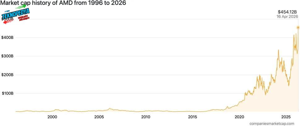 Yaklaşık 20 yıl boyunca düşük ve dalgalı bir piyasa değerine sahip olan AMD, 2000’li yılların başındaki Athlon ve orta dönemindeki Athlon 64 ile Opteron başarılarına rağmen kalıcı bir yükseliş yakalayamamıştı. Ancak 2017 yılında Zen mimarisinin tanıtılması ve EPYC ile Ryzen işlemcilerin piyasaya sürülmesi, şirket için kırılma noktası oldu. 2020 yılı civarında 100 milyar dolar seviyesini aşan piyasa değeri, yatırımcı güveninin yeniden kazanıldığını gösterdi. Intel 25 yılın zirvesinde