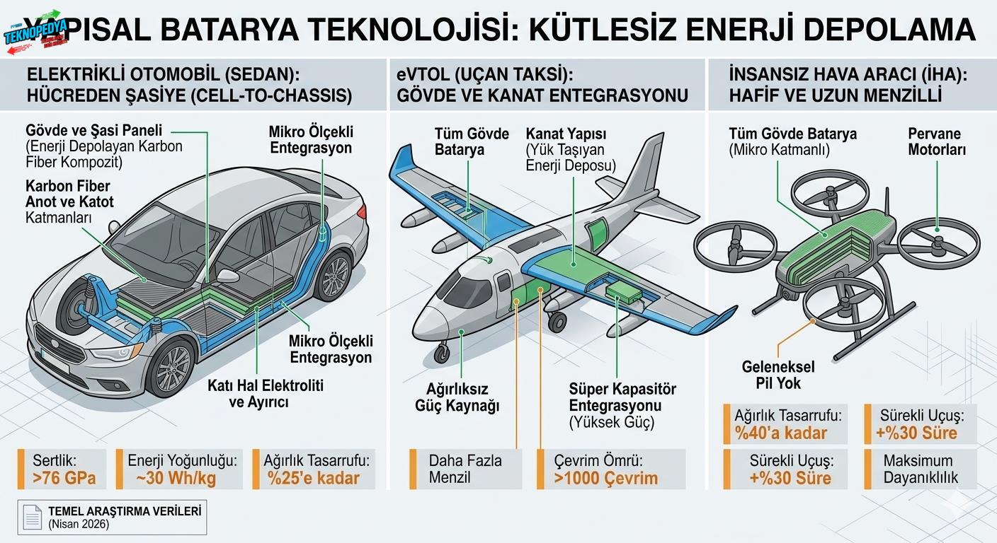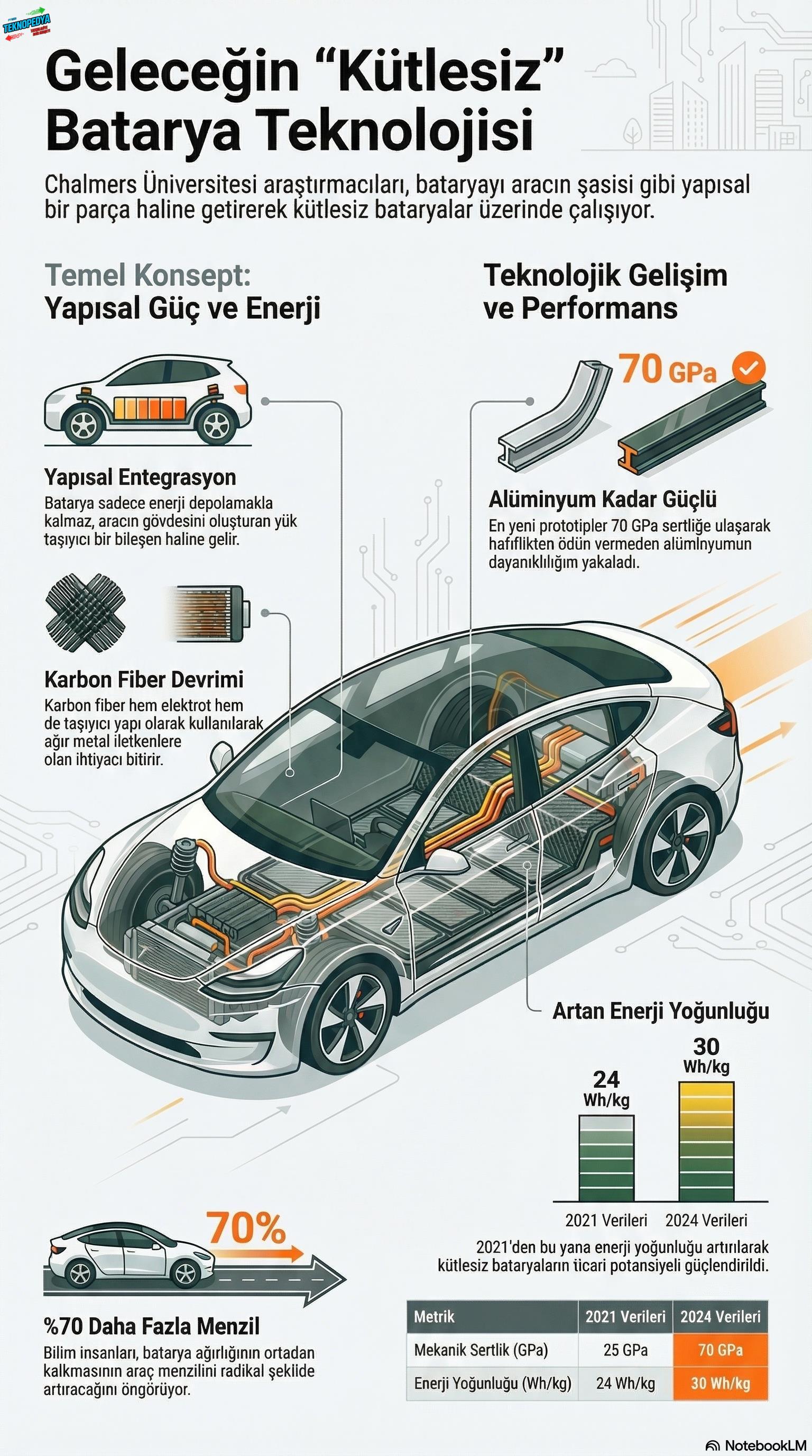 Ekstra yük getirmeyen bir batarya yapmanın en kolay yolu bataryadan araç yapmanız. İsveç’teki , Chalmers Teknoloji Üniversitesi’de bu heyecan verici fikrin peşinden 20 yıldır koşuyor. Chalmers Teknoloji Üniversitesi’ndeki araştırmacıların geliştirdiği karbon fiber kompozit batarya, alüminyum kadar dayanıklı olmayı başardı. Böylece şasiyi, kaputu, tavanı, tabanı ve hatta koltukların iskeletlerini bile batarya olarak kullanabilirsiniz.